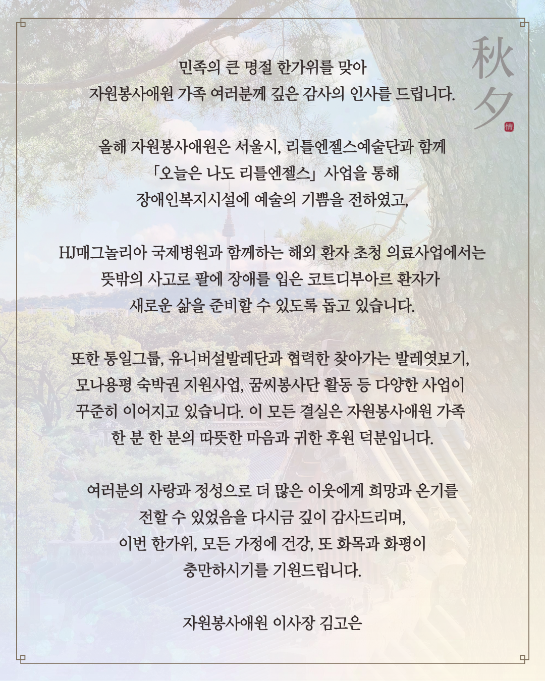 민족의 큰 명절 한가위를 맞아 자원봉사애원 가족 여러분께 깊은 감사의 인사를 드립니다.