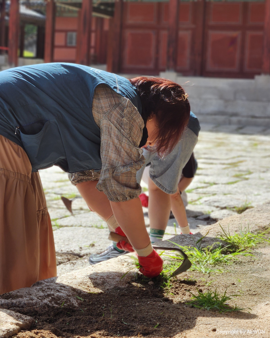 강렬한 햇빛 아래에서도 모두가 열심히 창경궁 곳곳에 자리한 잡초를 제거하고 주변 환경을 정돈하며