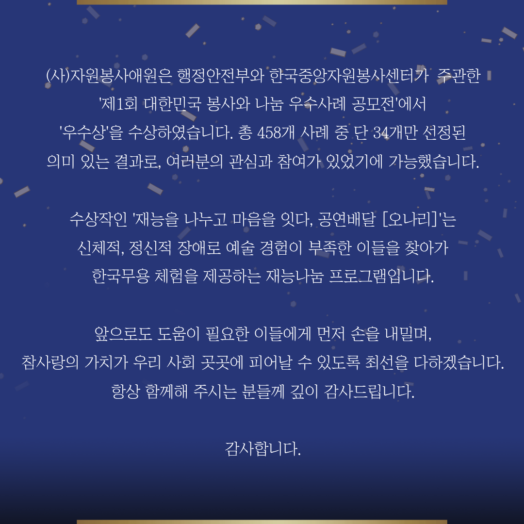 애원은 행정안전부와 한국중앙자원봉사센터가 주관한 '제1회 대한민국 봉사와 나눔 우수사례 공모전'에서 '우수상'을 수상하였습니다.